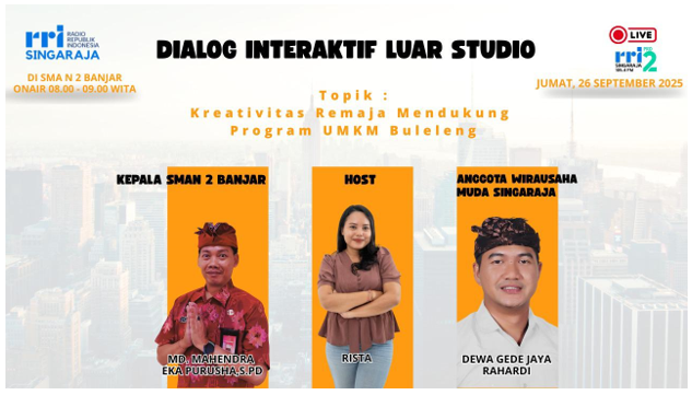 Posted inAgenda Talkshow RRI di SMANDAR: Panggung Inspiratif Wirausaha Muda Buleleng Posted by admin 29 September 2025 Banjar, 27 September 2025 SMA Negeri 2 Banjar (SMANDAR) sukses menggelar Talkshow bersama Radio Republik…